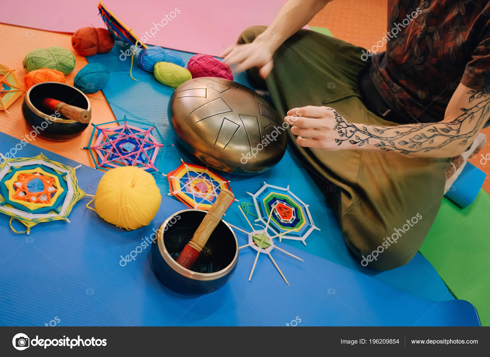 Young Caucasian Man Henna Tattoo His Hand Playing Hang Drum Stock Photo C Gilitukha 196209854